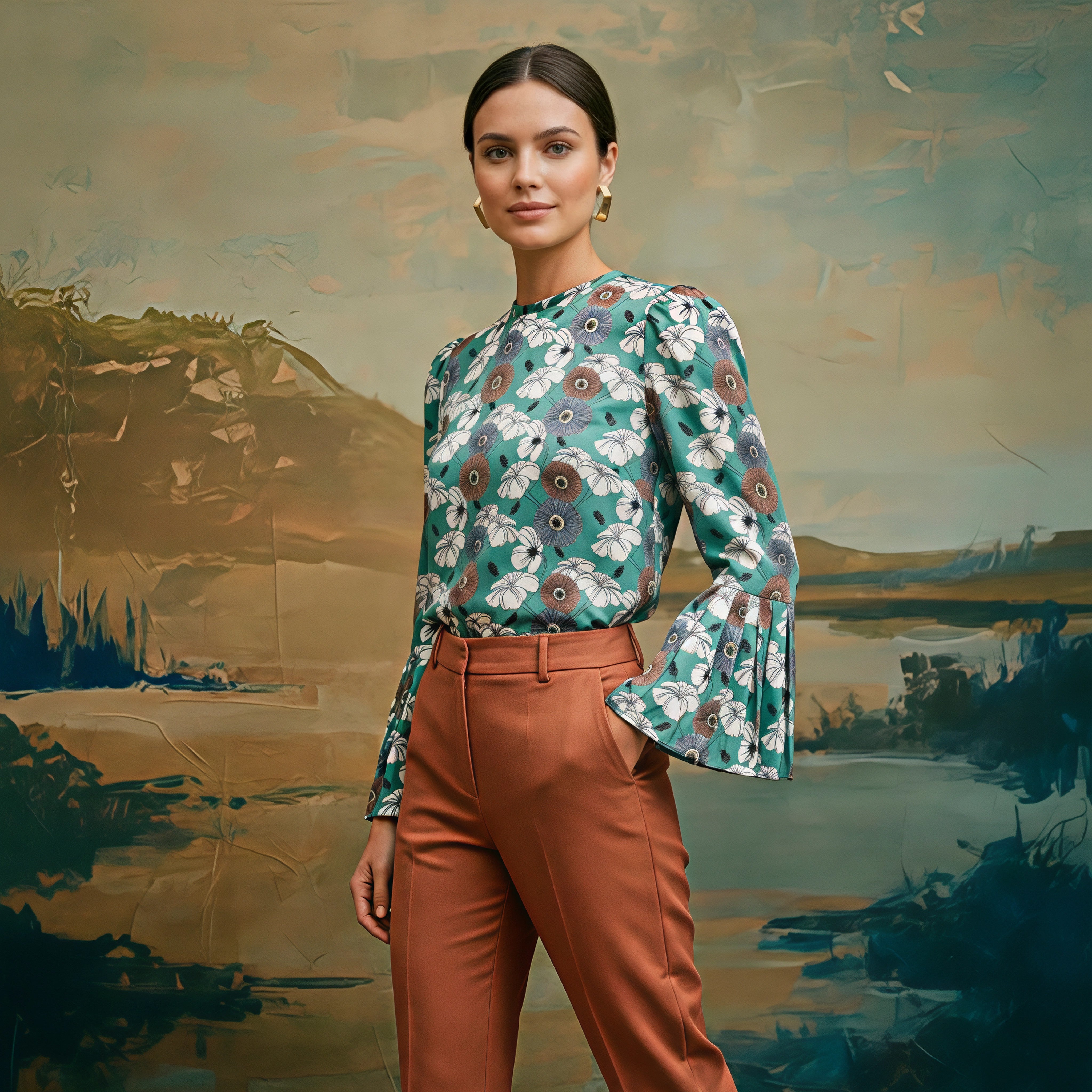 Inspirada en la atmósfera serena de los paisajes históricos, esta pieza traduce el motivo botánico en una danza de verde salvia y tonos neutros sobre el tejido. Una silueta de diseño de autor nacida para elevar la presencia y celebrar el equilibrio entre el romanticismo y la distinción.