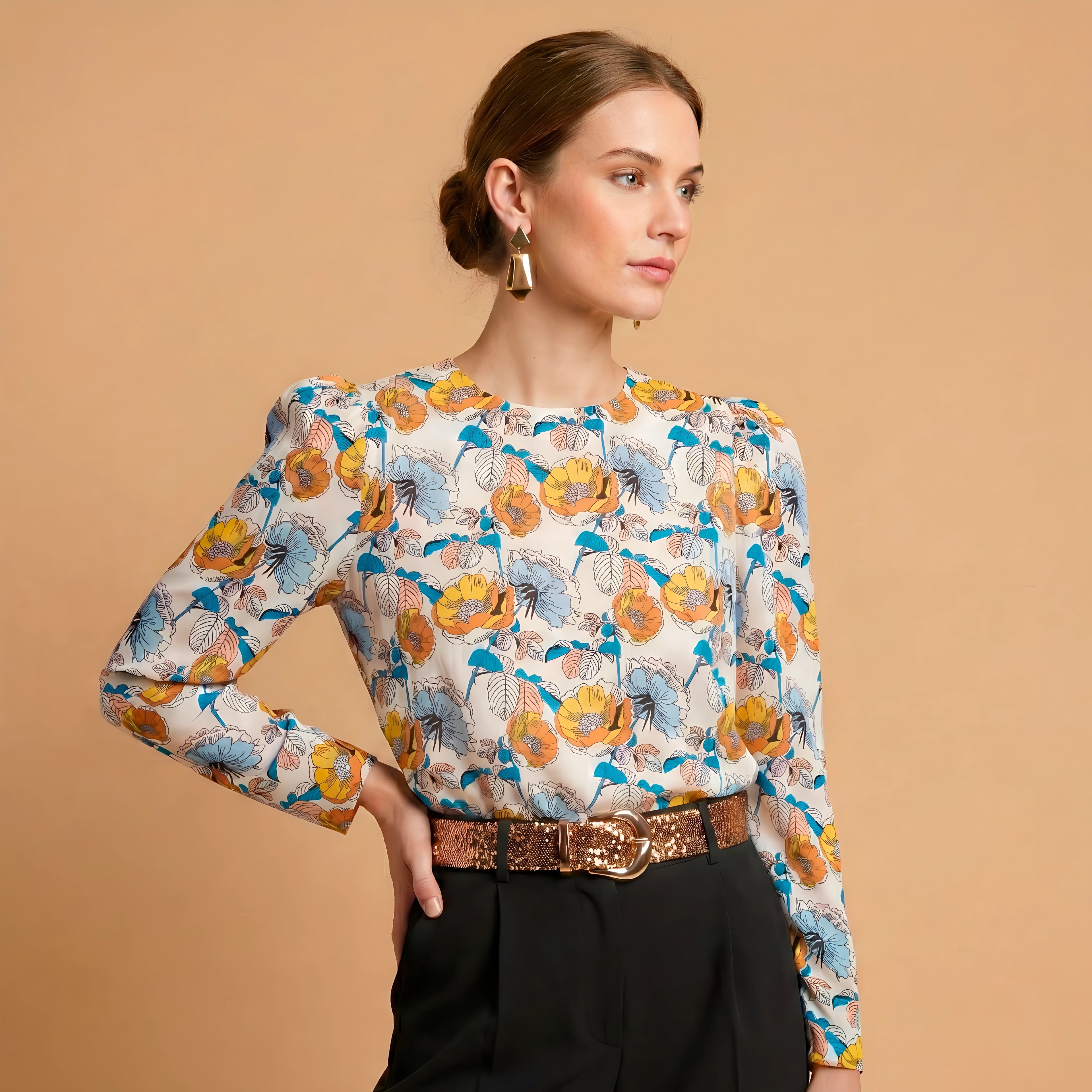 This composition evokes Victorian romanticism through a contrast of maximum sophistication. Upon the luminous base of the blouse, hand-drawn roses dance in warm amber and curaçao blue, displaying a pictorial delicacy that finds its perfect antithesis in the depth of the black trousers. The dazzling link is the copper sequined belt, which sculpts the silhouette like an architectural jewel. This metallic flash, enhanced by the precise volume of the shoulders, creates a look of magnetic presence that fuses artisanal nostalgia with a contemporary aesthetic.