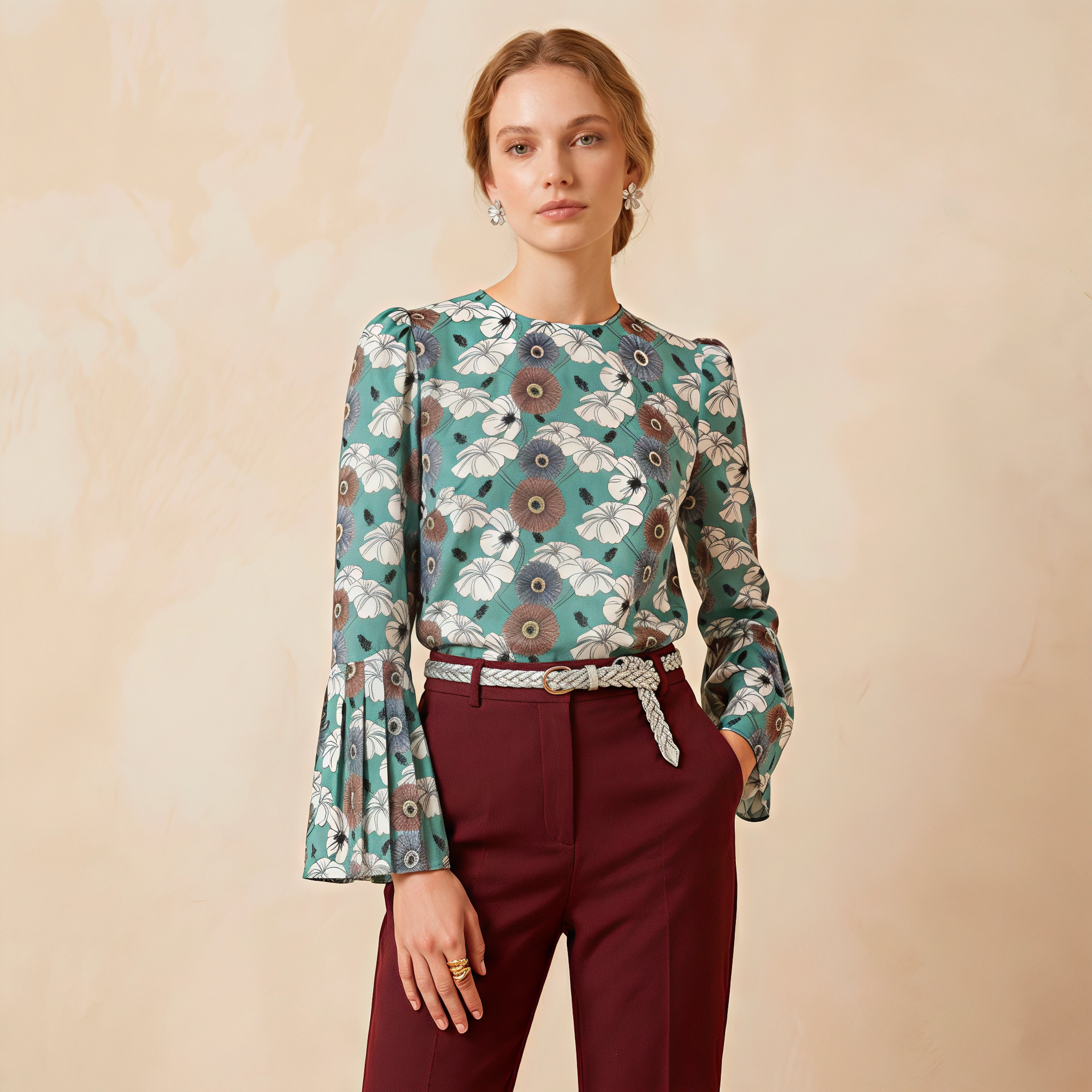 Inspirada en la atmósfera serena de los paisajes históricos, esta pieza traduce el motivo botánico en una danza de verde salvia y tonos neutros sobre el tejido. Una silueta de diseño de autor nacida para elevar la presencia y celebrar el equilibrio entre el romanticismo y la distinción.