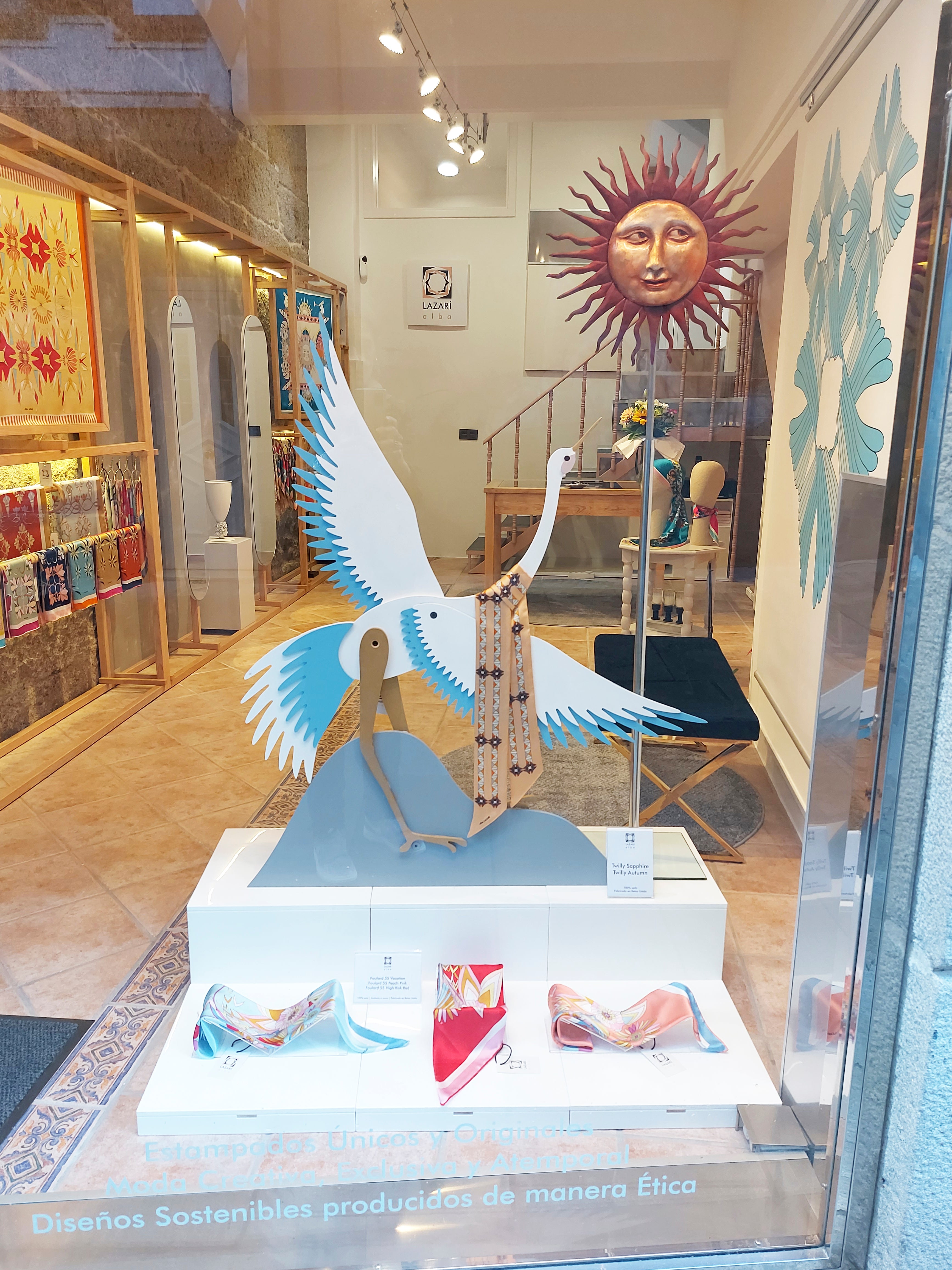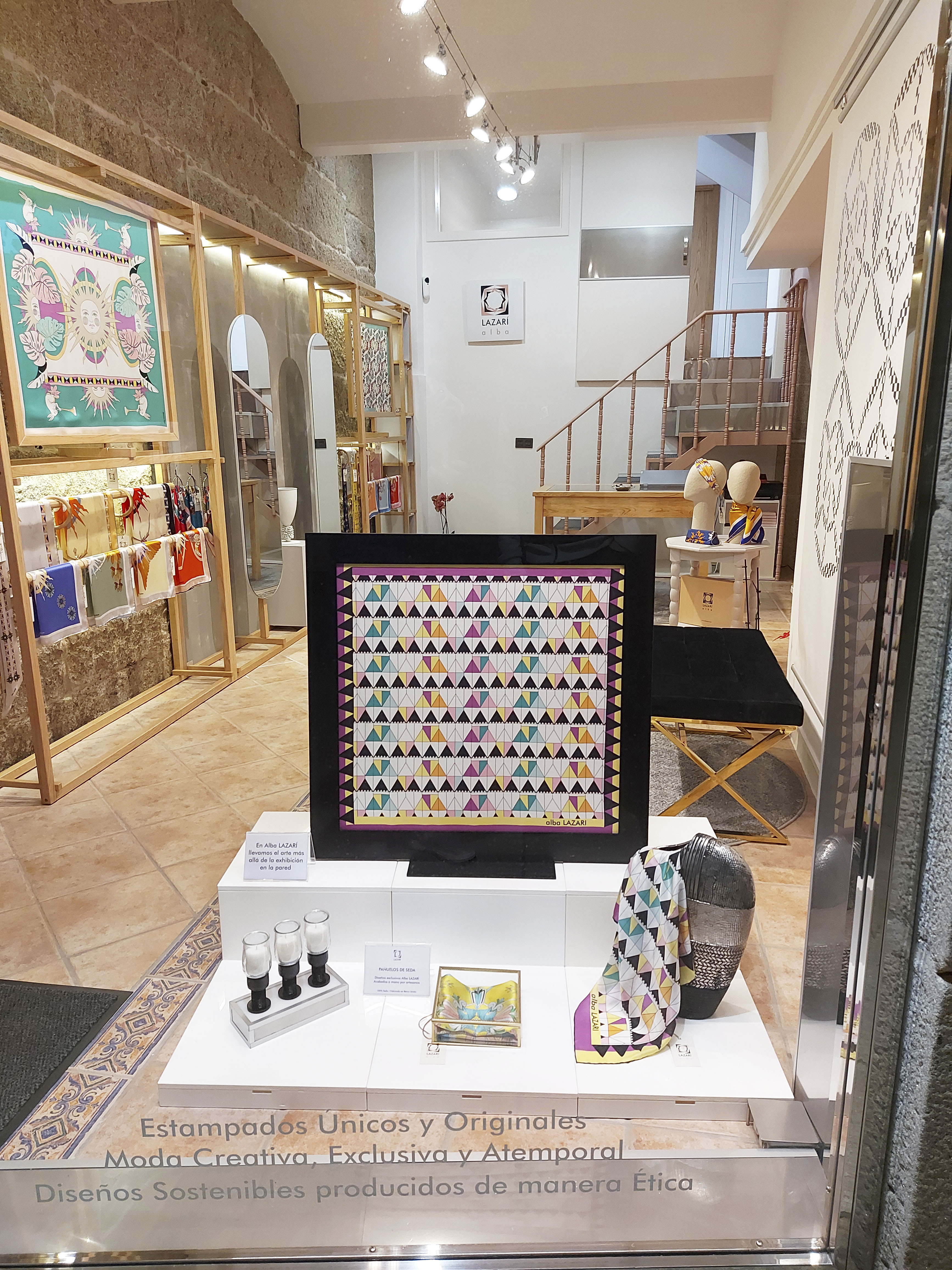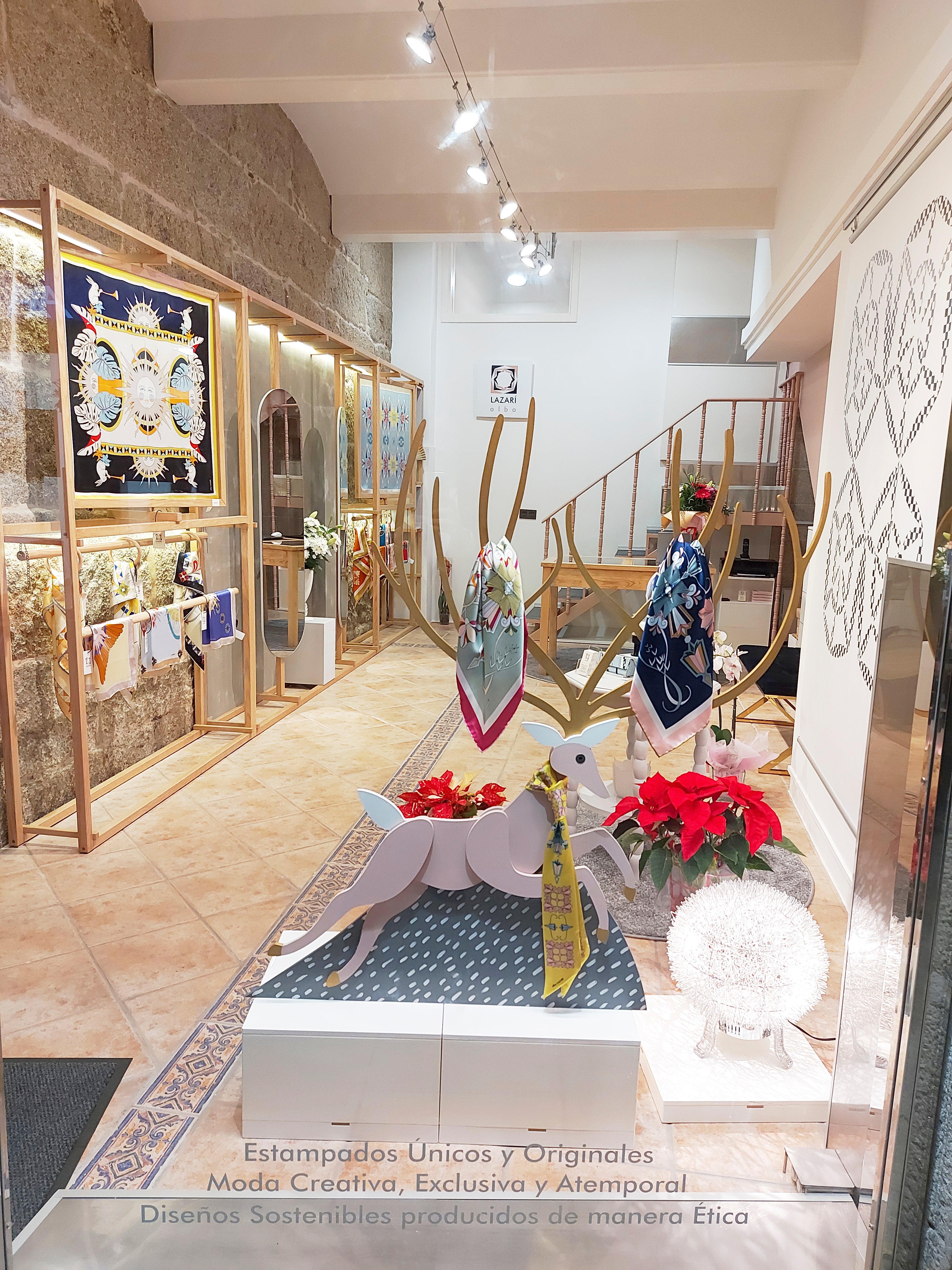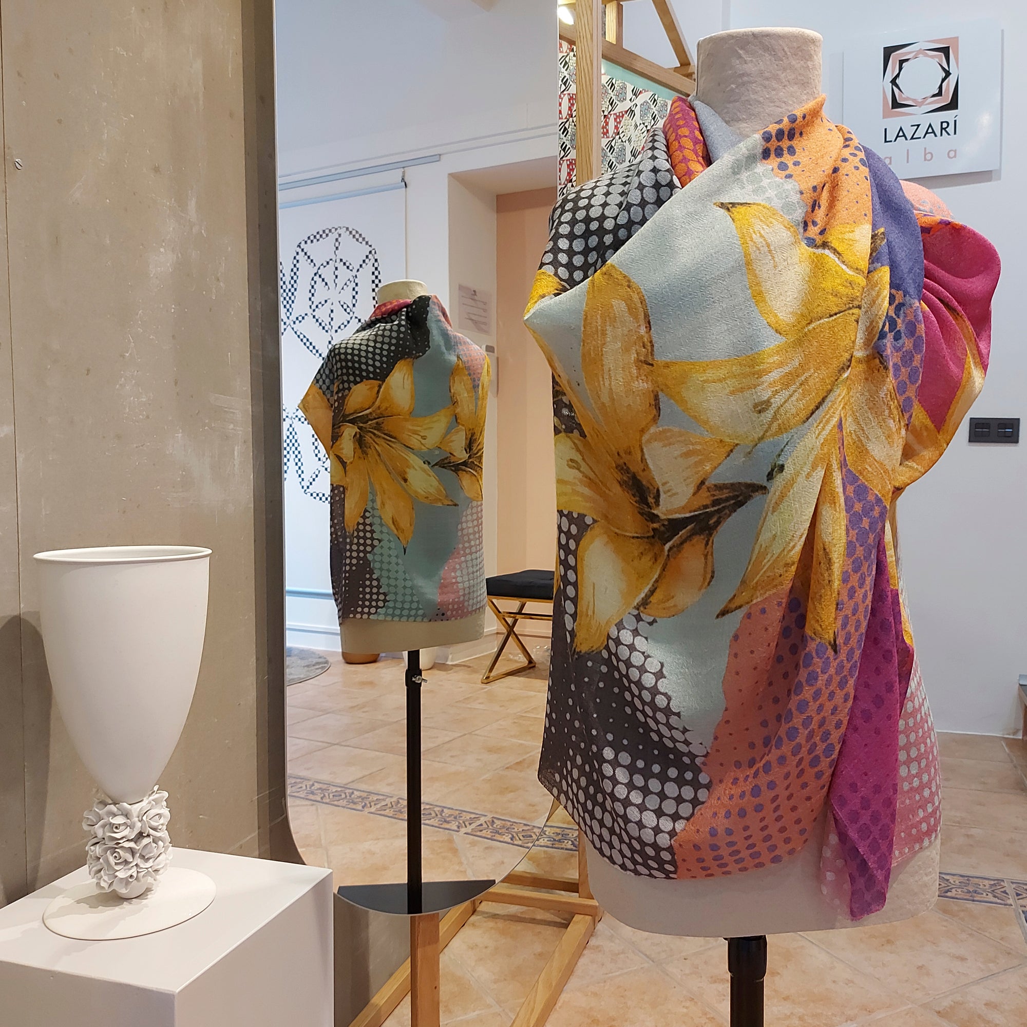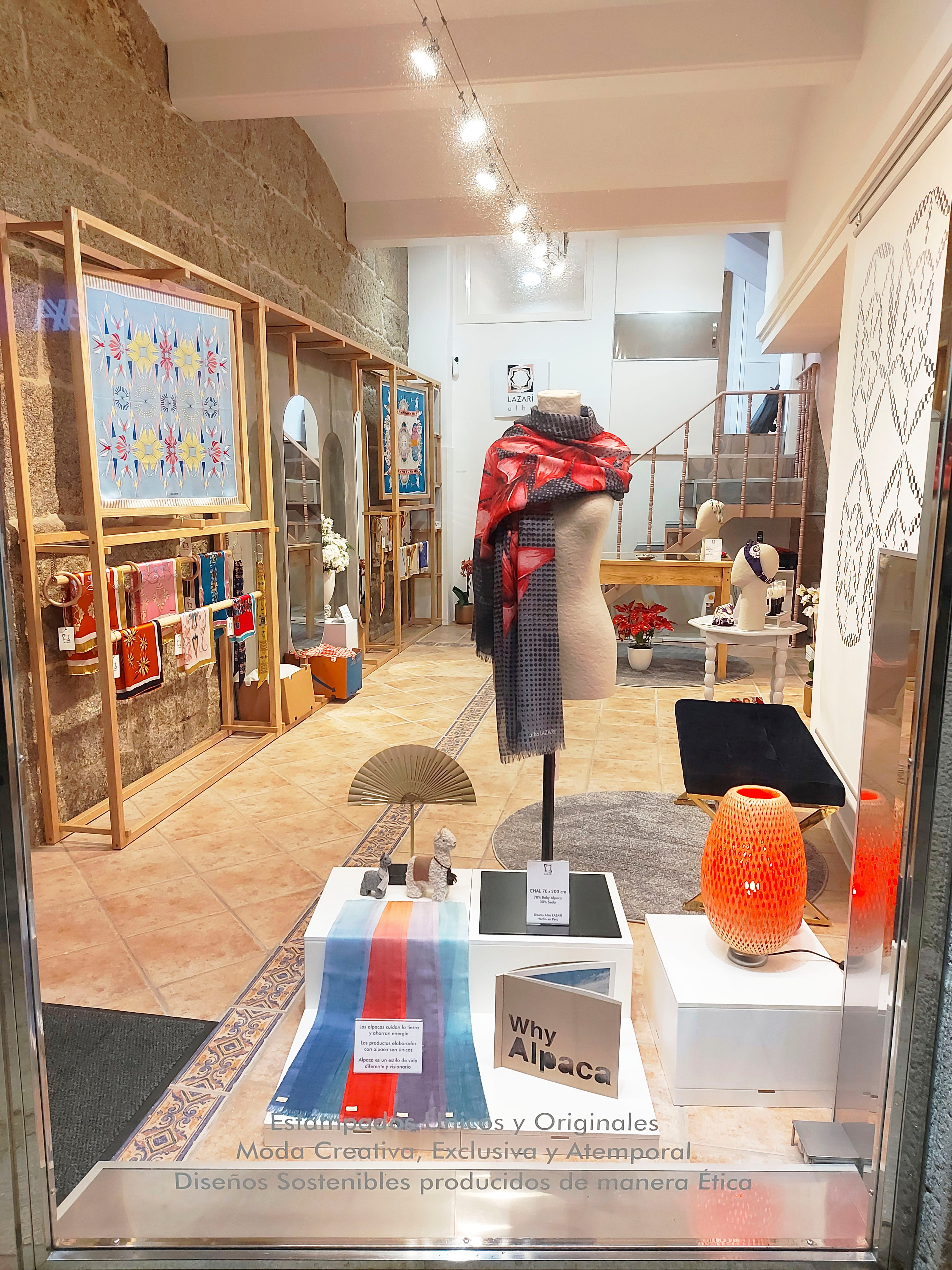 Ubicado en Cangas, Galicia, nuestro showroom es el epicentro creativo de Alba LAZARÍ. Un espacio donde el diseño textil y las Bellas Artes se fusionan: desde las paredes que exhiben lienzos de seda hasta el atelier donde la diseñadora proyecta cada colección. Un centro de creación donde el arte se vuelve tangible para la moda y el interiorismo.